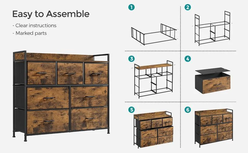 A storage dresser with 7 drawers, an accessory kit and detailed user manual for an easy assembly,